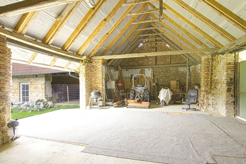 Stodolu s vysokým stropem – vhodnou pro skladování, ateliér nebo přestavbu na další obytný prostor