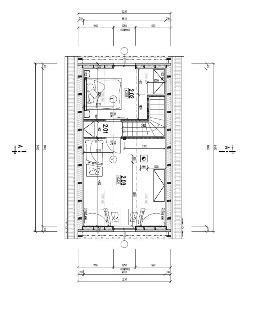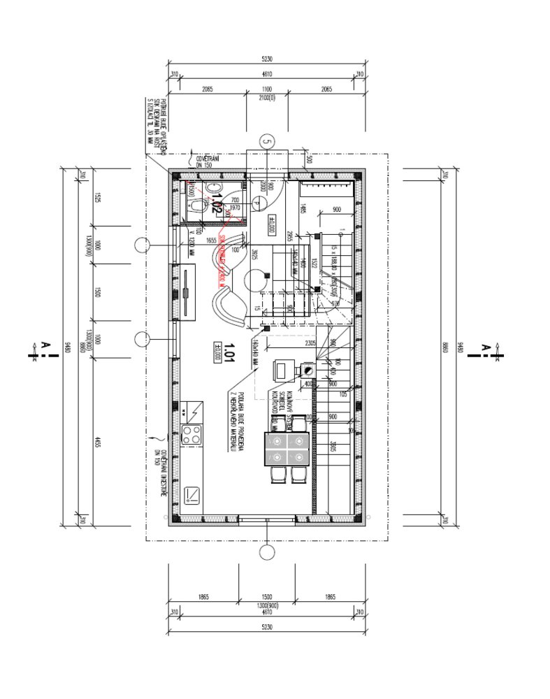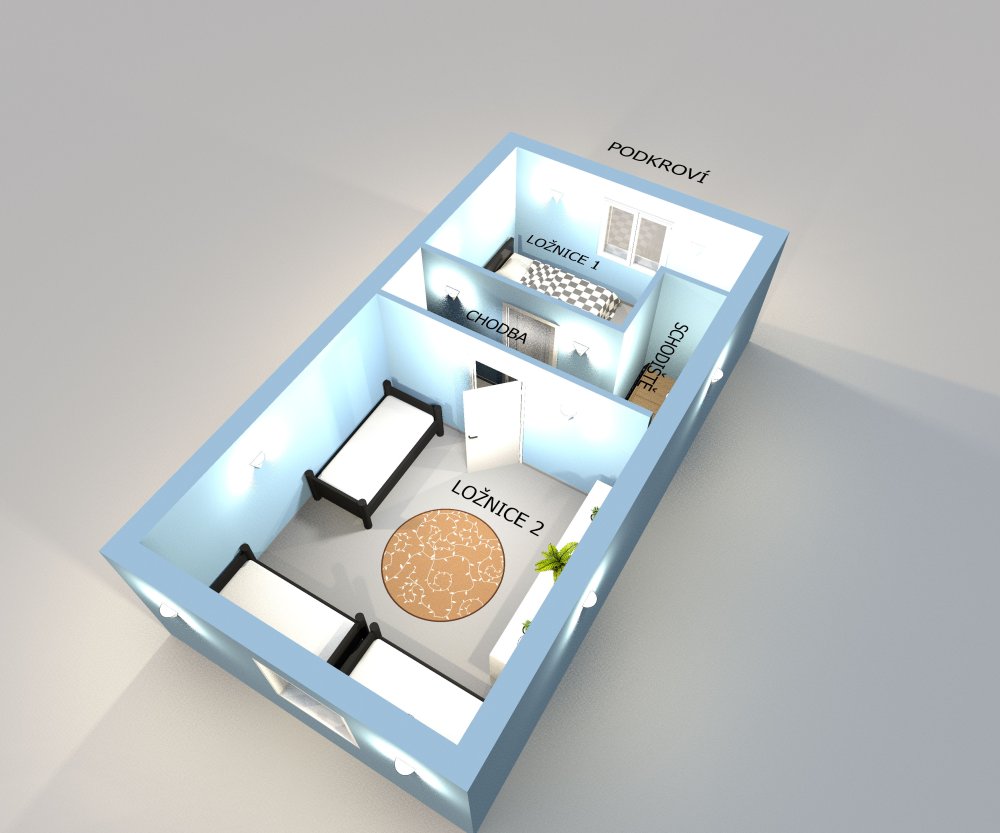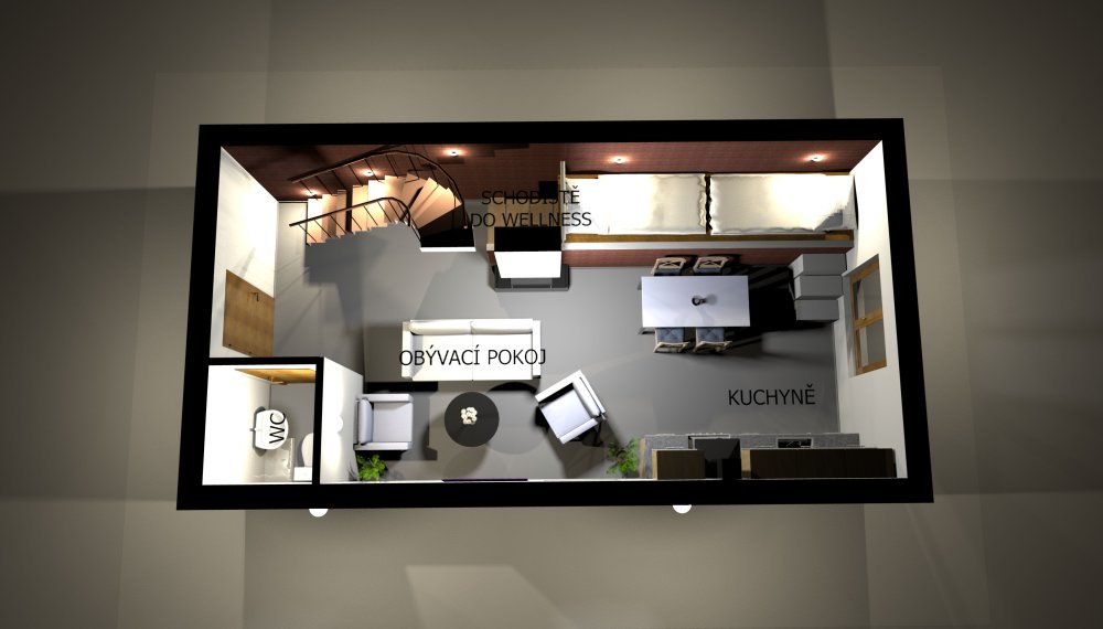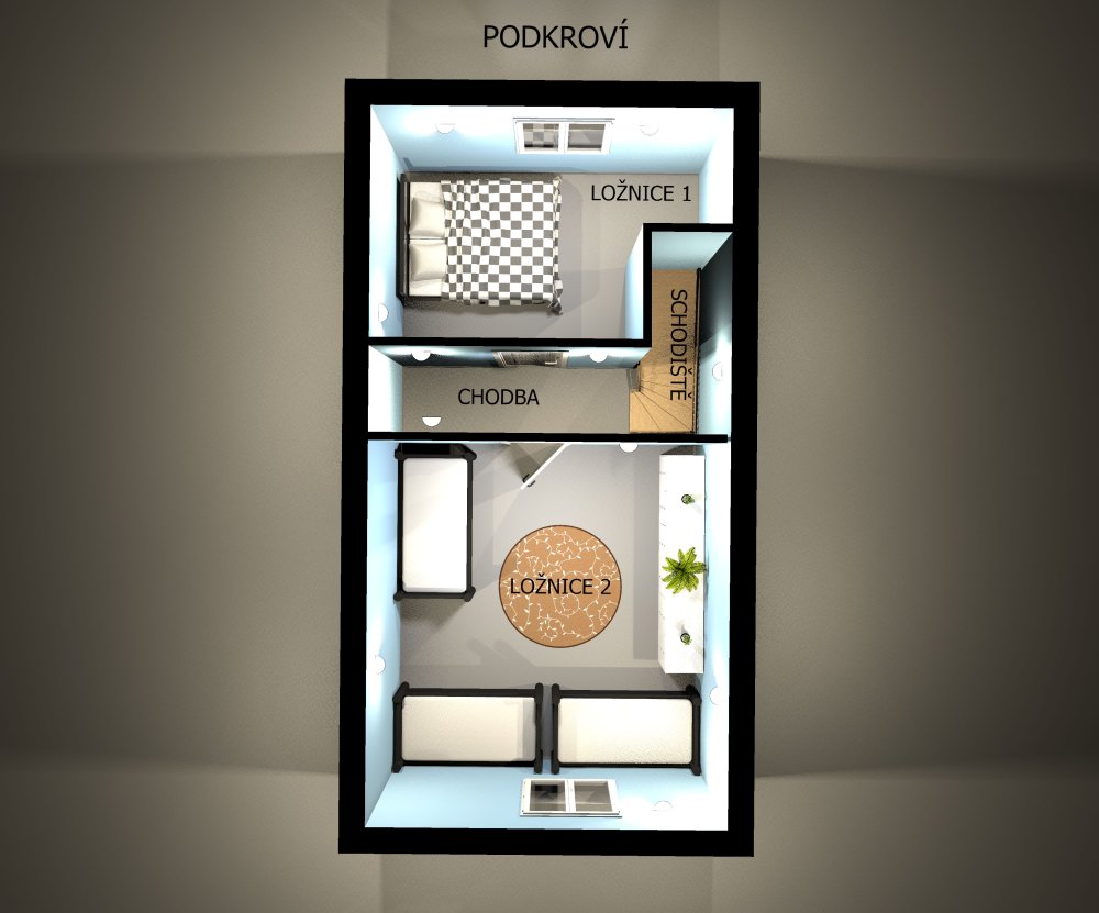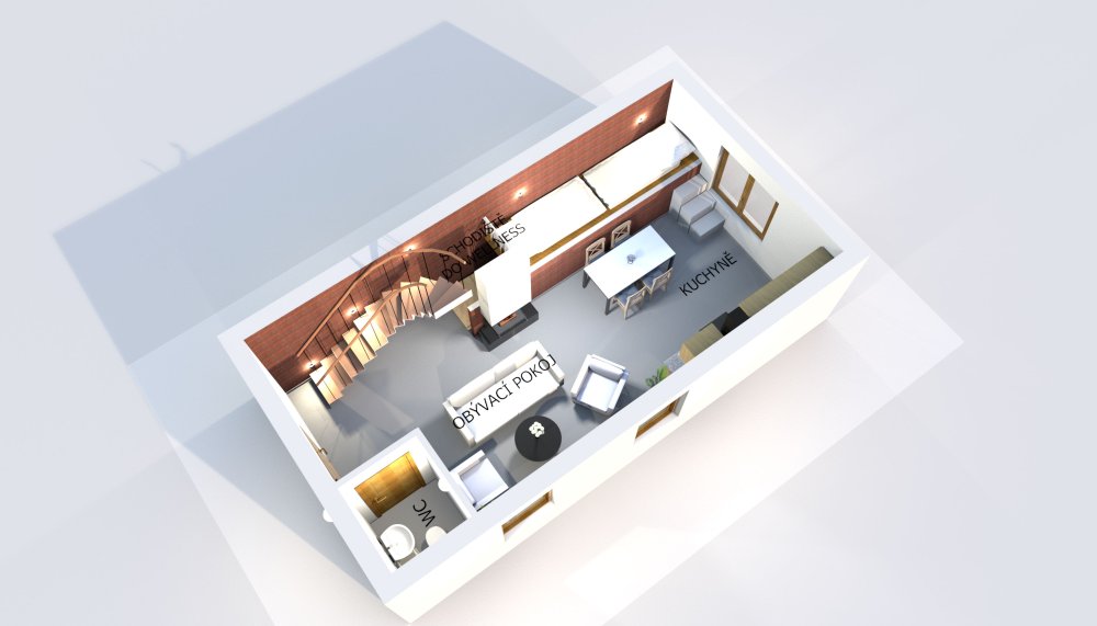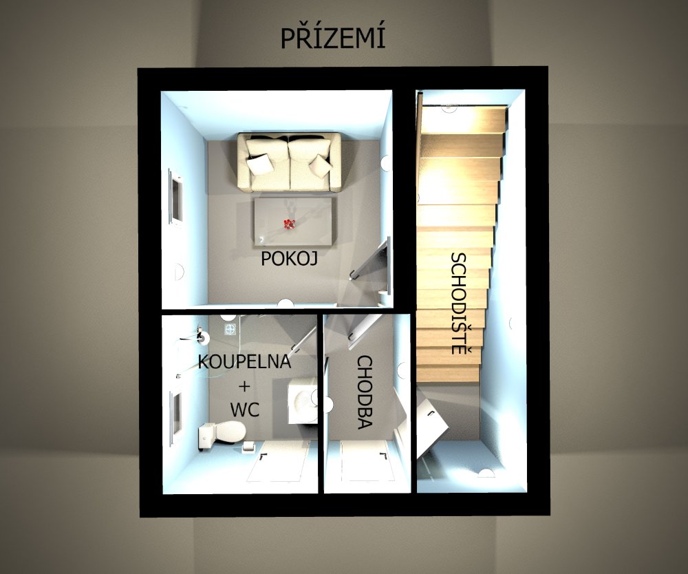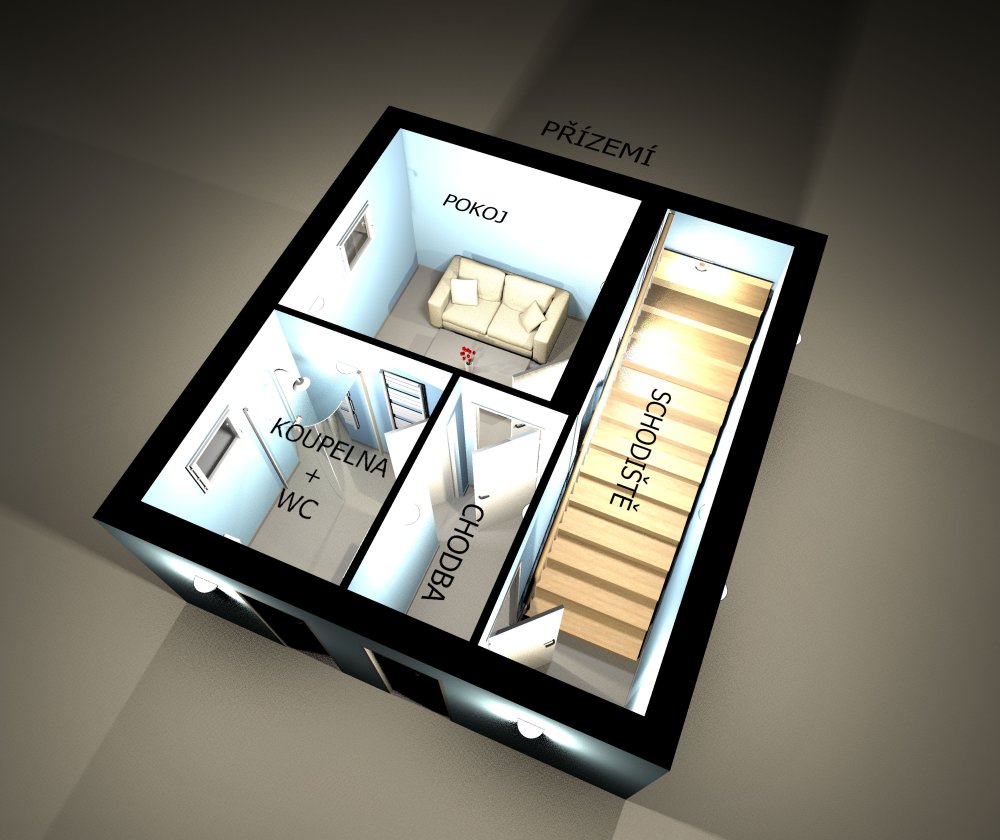 K dispozici je projektová dokumentace pro moderní chatu s wellness zónou, denní částí s obývacím pokojem a kuchyní v přízemí a dvěma ložnicemi v podkroví.