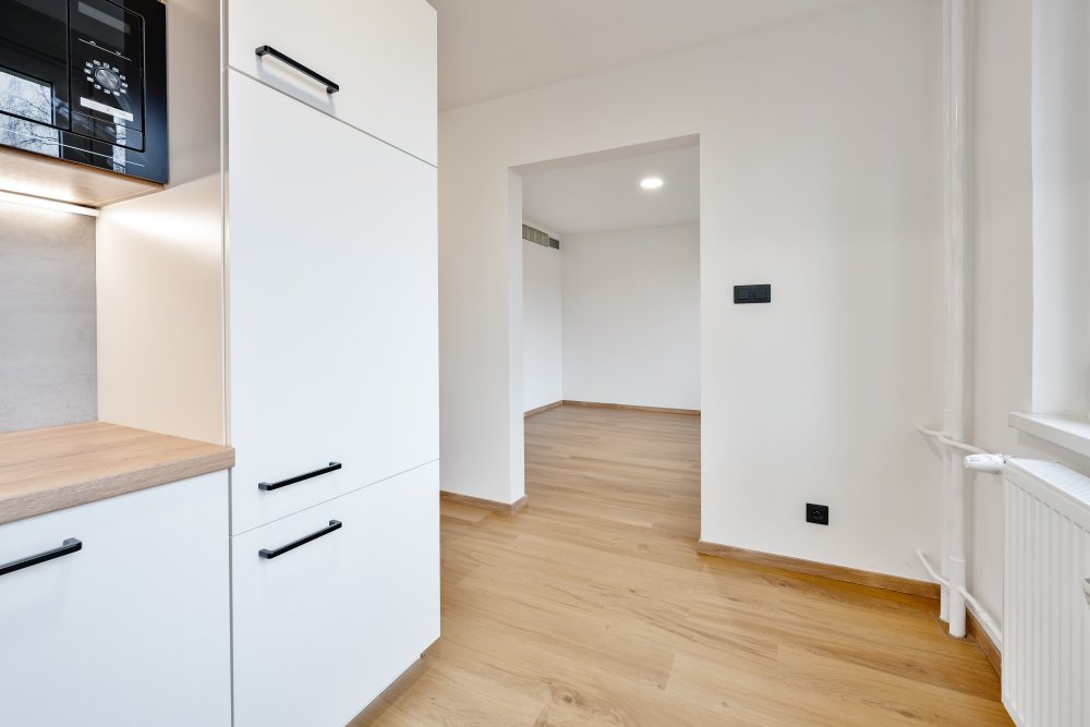 Byt prošel změnou dispozice na současné 3+1 a samozřejmostí je důkladná rekonstrukce. Nové jsou rozvody elektřiny i vody, veškeré podlahy, sádrokartonové podhledy, nové interiérové dveře včetně obložkových zárubní a samozřejmě také kompletní koupelna i kuchyně včetně vestavných spotřebičů jako je myčka, indukční deska, elektrická trouba, mikrovlnná trouba, digestoř i lednice.